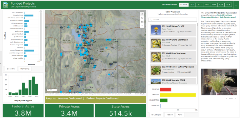 Utah was the first western state to develop a public weed distribution and treatment HUB and dashboard. By collecting high-quality spatial data on weed occurrences and treatments, Utah built the foundation for a suite of additional dashboards that now display federally funded projects, state-funded projects, and weed biological control efforts.